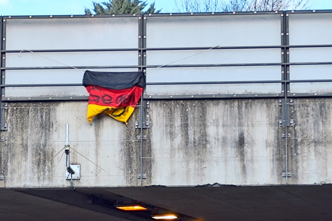 Schon wieder hat jemand eine schwarz-rot-goldene Fahne über der Tunneleinfahrt aufgehängt. Die Polizei reagiert gelassen.