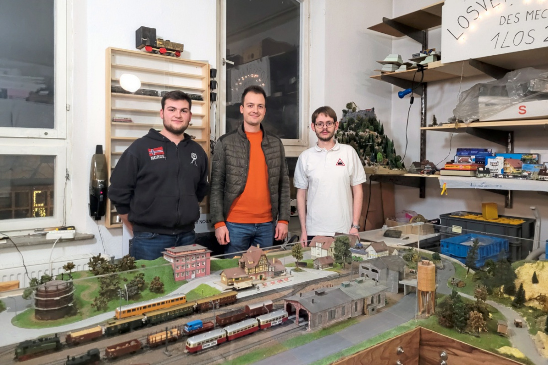 Auch der Modelleisenbahnclub präsentiert bei der Fleckenweihnacht seine Schätze. Auf dem Bild sind von links Tom Pfänder, Marcel Bauer und Christian Weber zu sehen. Foto: Sara Hiller