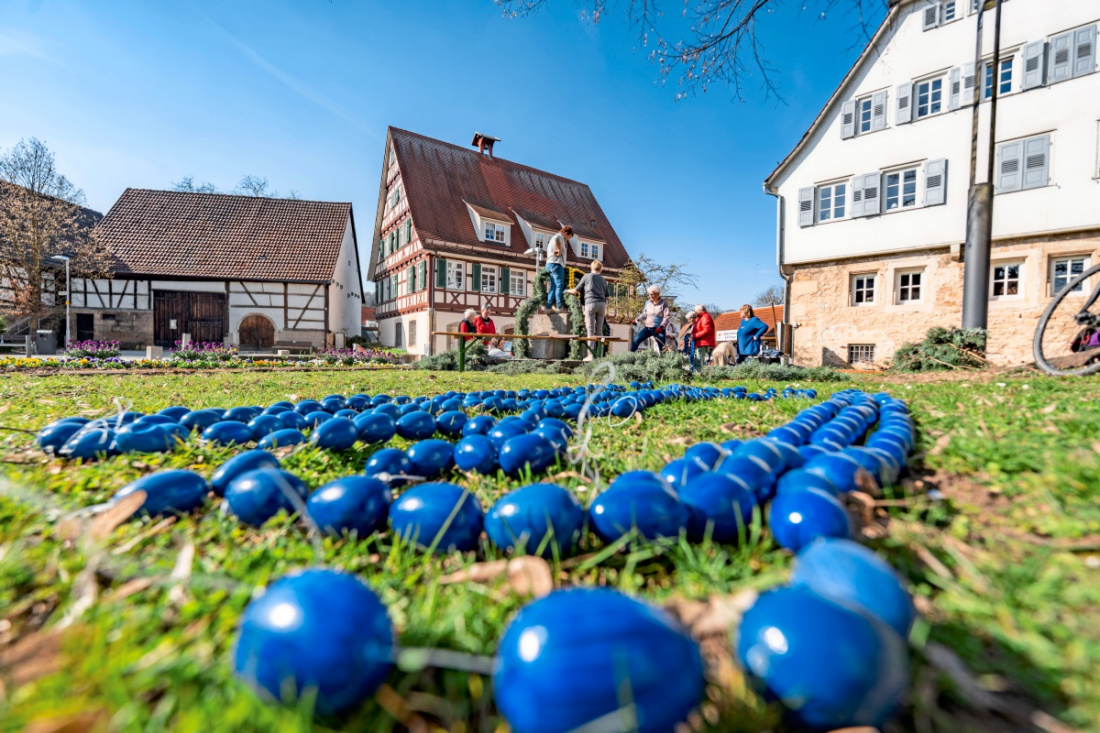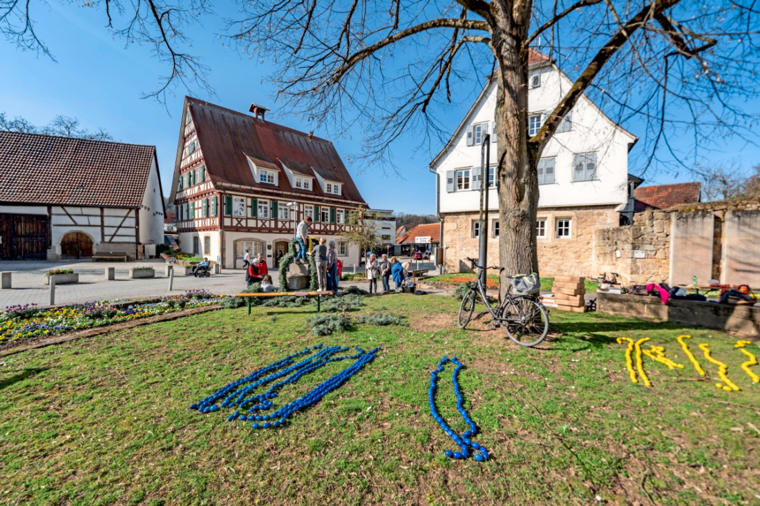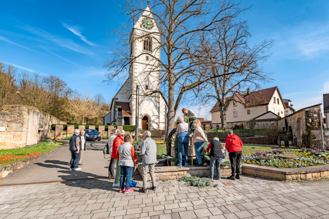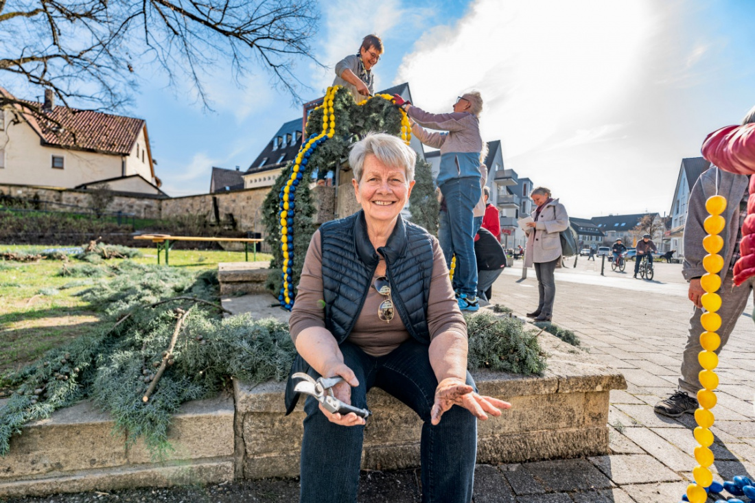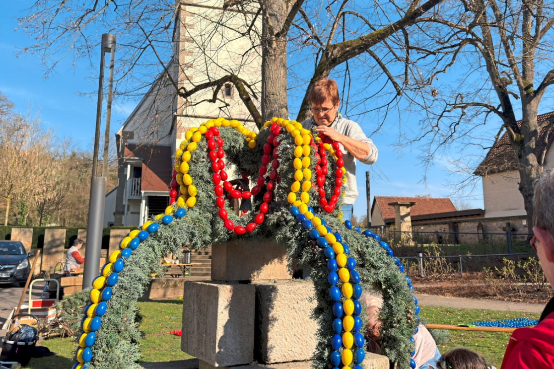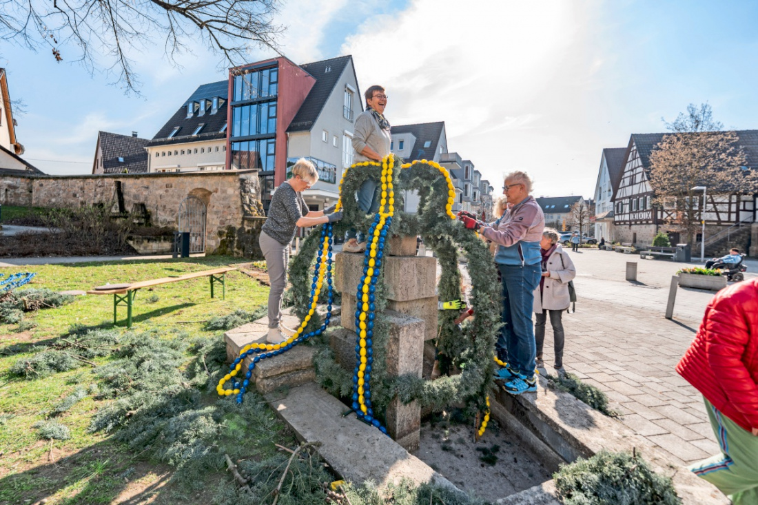 Viele Hände helfen beim Schmücken des Neckartenzlinger Osterbrunnens