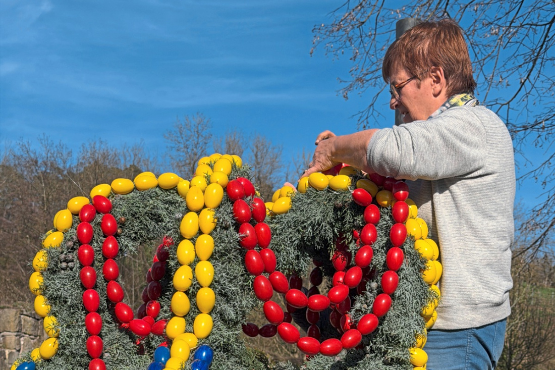 NECKARTENZLINGEN. Karin Löw balancierte auf einem der oberen Steine und überragte den Feuerwehrbrunnen in Neckartenzlingens Ortsmitte. Mit einer Hand hielt sie eine zweireihige, aus gelben Eiern gefertigte Girlande fest, mit der anderen band sie sie mit einem Draht an einen Arm der Osterkrone. Wie jedes Jahr half Karin Löw am Donnerstag beim Aufbau des