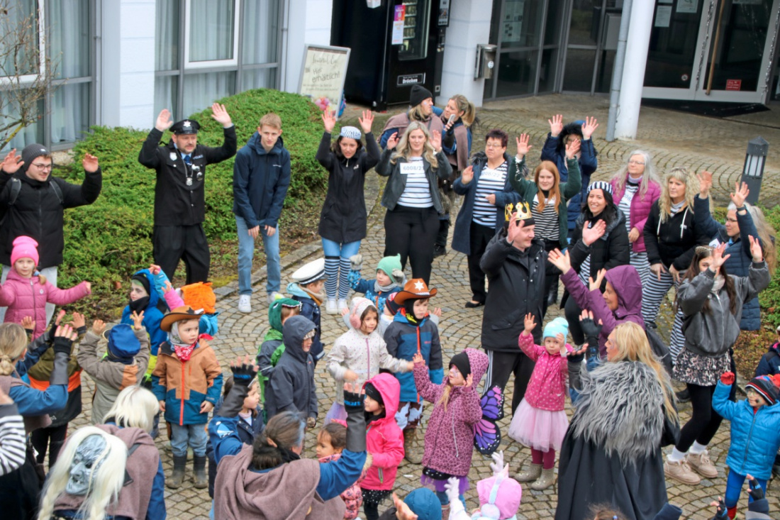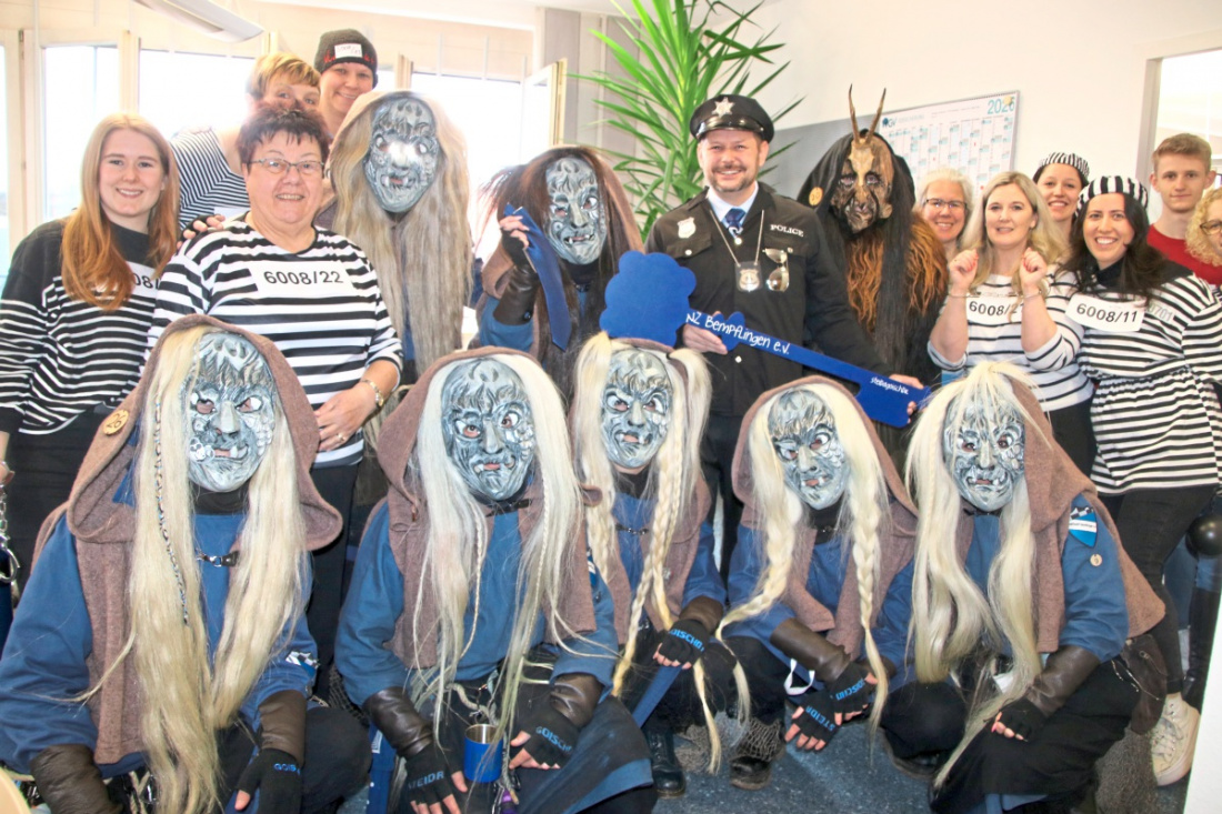 Der Bürgermeister und die Mitarbeiterinnen der Verwaltung mit den Steidagoischd’rn nach der Erstürmung des Rathauses.Foto: Kirsten Oechsner