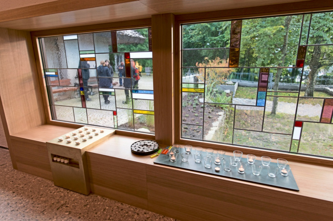 Wiedereröffnung der sanierten Aussegnungshalle auf dem Waldfriedhof in Wolfschlugen – diese schönen Fenster sind komplett neu, vorher war dort eine durchgehende Wand.Foto: Peter Dietrich