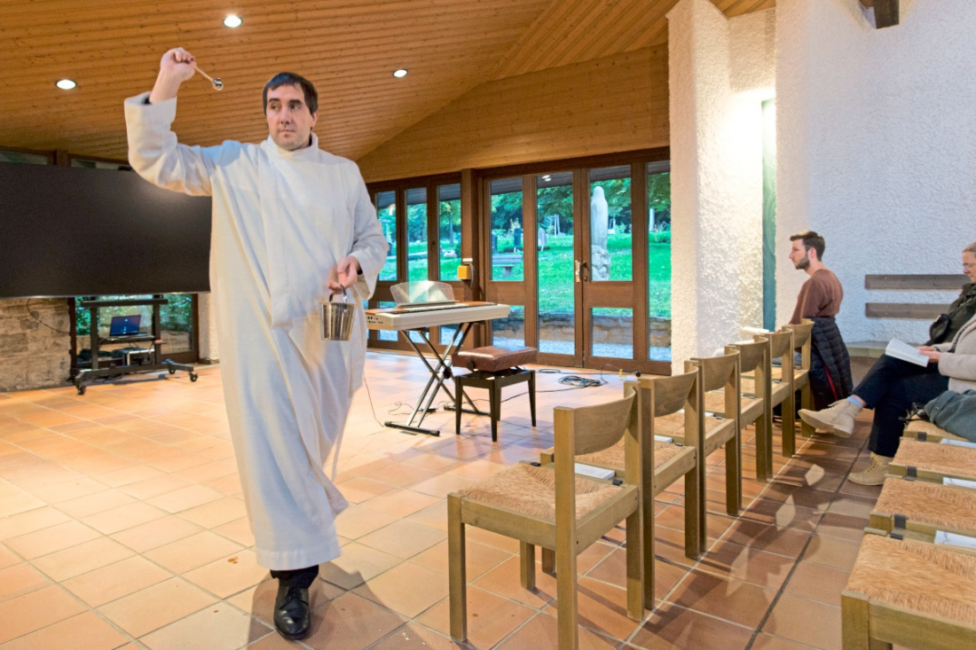 Christian Slunitschek verspritzt bei der Wiedereröffnung der Aussegnungshalle Weihwasser, das an die Taufe erinnern soll.Foto: Peter Dietrich