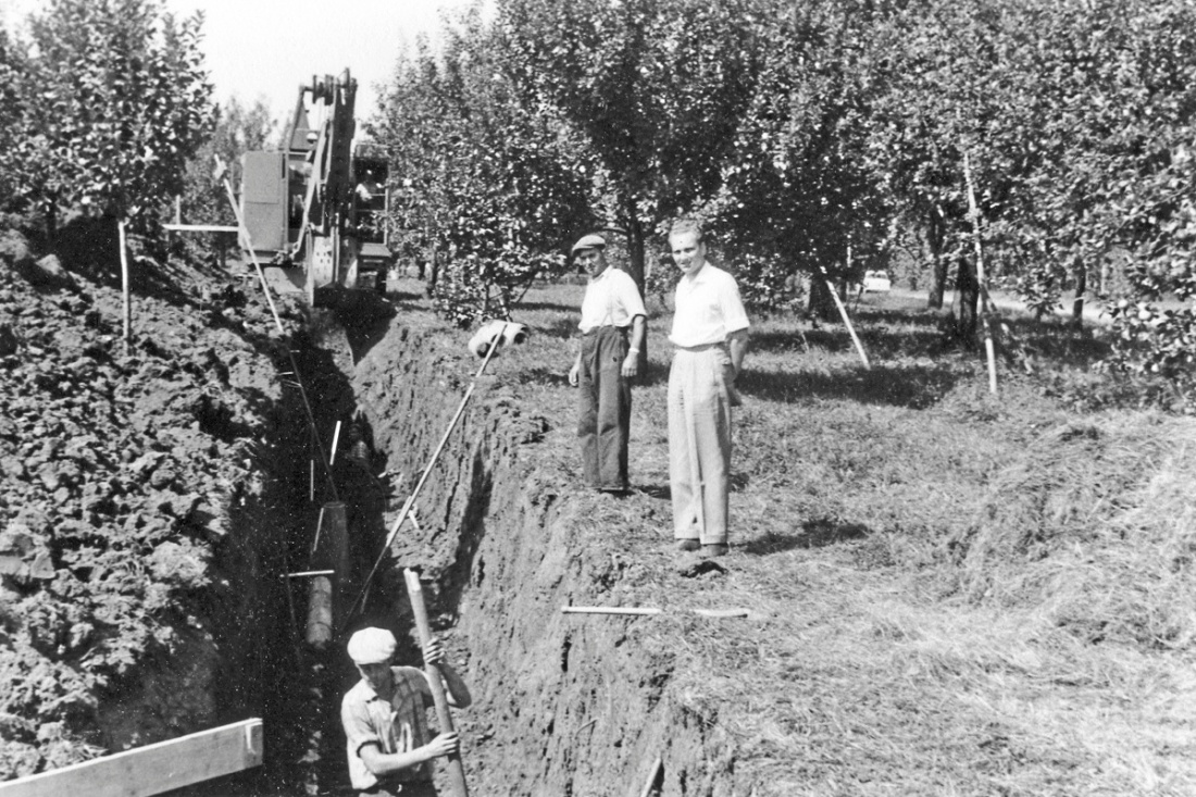 Mit der regen Bautätigkeit nach dem Zweiten Weltkrieg mussten auch etliche Leitungen verlegt werden. Beispielsweise zu den Aussiedlerhöfen der Landwirte und hier quer durch eine Streuobstwiese.Foto: Gemeinde Köngen