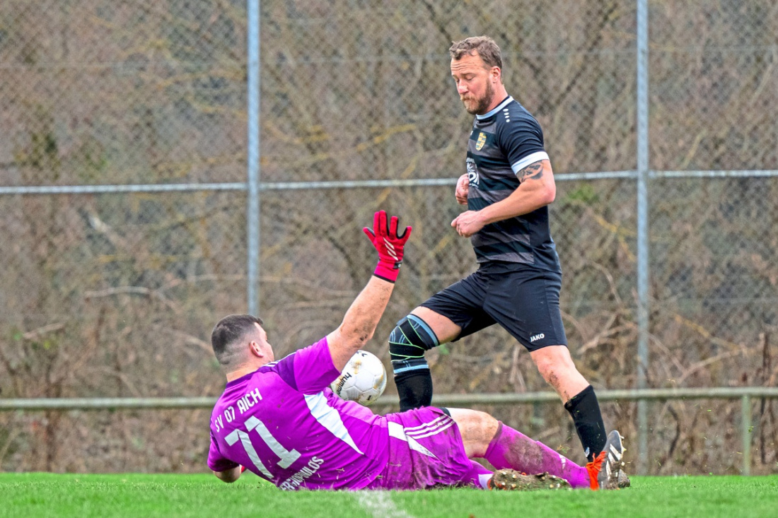 Manuel Hausser und die SG Aichtal drehten nach der Pause auf. Aichs Torwart DimItrios Stergiopoulos konnte die Niederlage nicht verhindern. Foto: Stefan Rosenfeld
