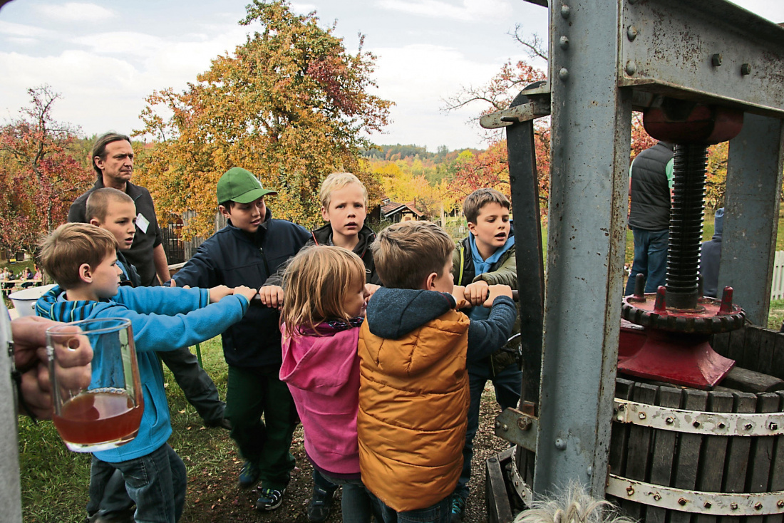 Saft pressen erforderte früher Muckis: Mit vereinten Kräften bewegen diese sieben Jungen und Mädchen die Presse. Nach so viel Anstrengung schmeckt der frisch gepresste Saft umso besser. Foto: zog