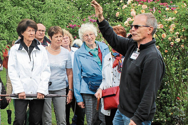 Wolfgang Jurisch (rechts) bei der Führung durch seinen Rosengarten.