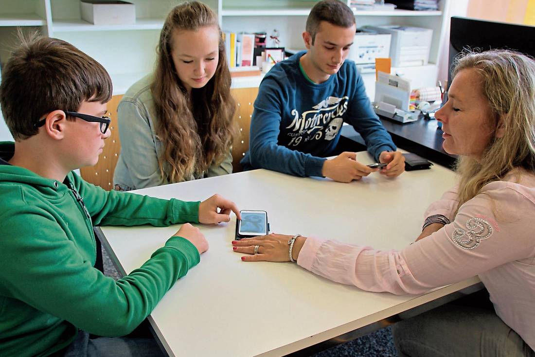 An der Ludwig-Uhland-Schule müssen Handys den gesamten Schultag über stumm und unsichtbar verstaut sein. Die Siebtklässler Paul, Hanna und Ahmet (von links) haben damit kein Problem, wie sich im Gespräch mit Schulleiterin Regina Bönisch zeigt. Foto: Eisenhardt