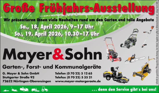 Die Vögel zwitschern, abends ist es länger hell und in Gärten und auf Wiesen beginnt wieder die Zeit des Mähens, Schneidens und Pflegens. Mit dem Frühling startet die aktive Grünpflege – und wer dafür bestens ausgerüstet sein möchte, sollte die Aktionstage von Mayer & Sohn am 18. April von 9 bis 17 Uhr und 19. April von 10.30 bis 17 Uhr in der Stuttgarter Straße 92 in Oberensingen nicht verpassen. Der zertifizierte Fachbetrieb gilt seit Jahrzehnten als verlässlicher Ansprechpartner für Motorgeräte aller Art – für private Anwender ebenso wie für professionelle Nutzer aus Garten‑, Forst‑ und Kommunalbereich.