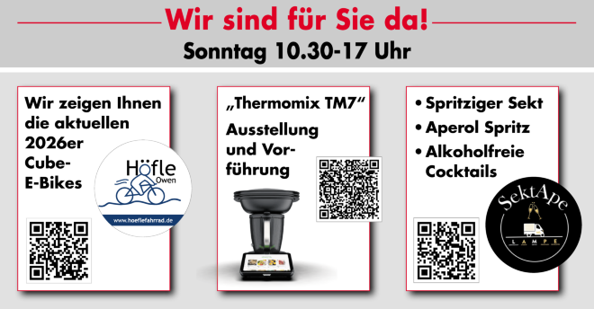 Für das leibliche Wohl sorgt an beiden Tagen der TSV Raidwangen. Am Schau-Sonntag erweitert sich das Programm zusätzlich: In Kooperation mit dem Fahrradgeschäft Höfle aus Owen werden aktuelle E‑Bikes präsentiert. Wer weniger technikaffin ist, findet Inspiration bei einer Thermomix‑Vorführung. Und an der SektApe können Besucherinnen und Besucher bei Spritz, Sekt oder alkoholfreien Cocktails eine erfrischende Pause einlegen – und schon einmal testen, wie sich der Feierabend nach getaner Gartenarbeit so anfühlt.