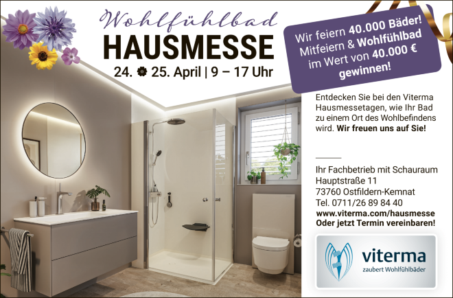 Der Badexperte aus Ostfildern lädt alle Interessierten zur Hausmesse am 24. und 25. April, jeweils von 9 bis 17 Uhr, in die Hauptstraße 11 ein. Hier können sich die Besucher und Besucherinnen von den innovativen und maßgeschneiderten Produkten aus eigener Herstellung und den zukunftssicheren Badlösungen inspirieren lassen. In persönlichen Gesprächen mit den Badexperten erfahren sie, wie rasch, einfach und unkompliziert eine Badsanierung sein kann. Denn viele Badezimmer sind in die Jahre gekommen, hohe Einstiege, enge Raumaufteilungen oder schwer zu reinigende Fliesenfugen machen die tägliche Nutzung oft zur Belastung. Die Experten von Viterma setzen genau hier an und denken das alte Badezimmer neu. Das Ergebnis ist eine Wohlfühloase ohne Stolperfallen und hohem Reinigungsaufwand.