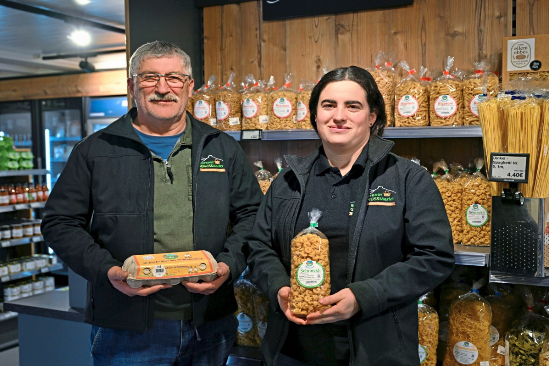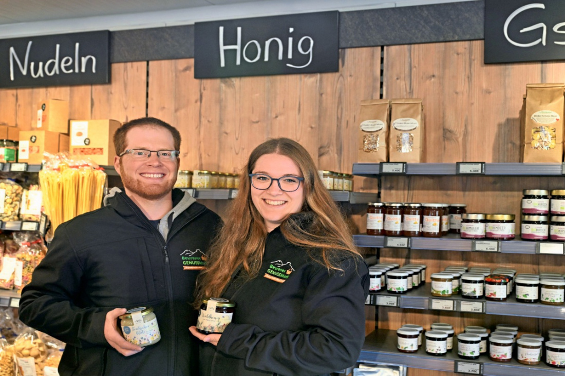 Dem stimmt Florian Rometsch, ebenfalls Genossenschaftsmitglied, zu: „Es ist eine tolle Chance, an so einem Standort ohne Personal, also mit wenig Arbeitseinsatz, Produkte verkaufen zu können.“ Für ihn sind neben der Regionalität die Gemeinschaft und das Kontaktnetzwerk weitere Pluspunkte. Zusammen mit seiner Frau Christiane Rometsch, Zweite Vorsitzende der Genossenschaft, betreibt der junge Familienvater einen landwirtschaftlichen Betrieb in erster Generation in Balzholz. Christiane Rometsch ist noch ein ganz anderer Aspekt wichtig: „Das gesamte Projekt Beurener Genussmarkt ist von der Entstehung bis jetzt sehr familienorientiert, sonst wäre es gar nicht möglich gewesen“, sagt die zweifache Mutter und strahlt.
