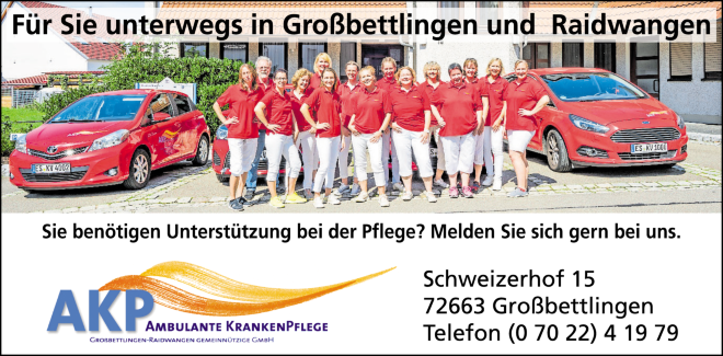 Auch im Seniorenbereich gibt es weit mehr als den üblichen Seniorennachmittag. Die Ambulante Krankenpflege (AKP) als eine hundertprozentige Tochtergesellschaft des Krankenpflegevereins Großbettlingen-Raidwangen e.V. hat große Bedeutung, ebenso wie der Neubau des Altenheims Maisch und die Vernetzung sozialer Einrichtungen.